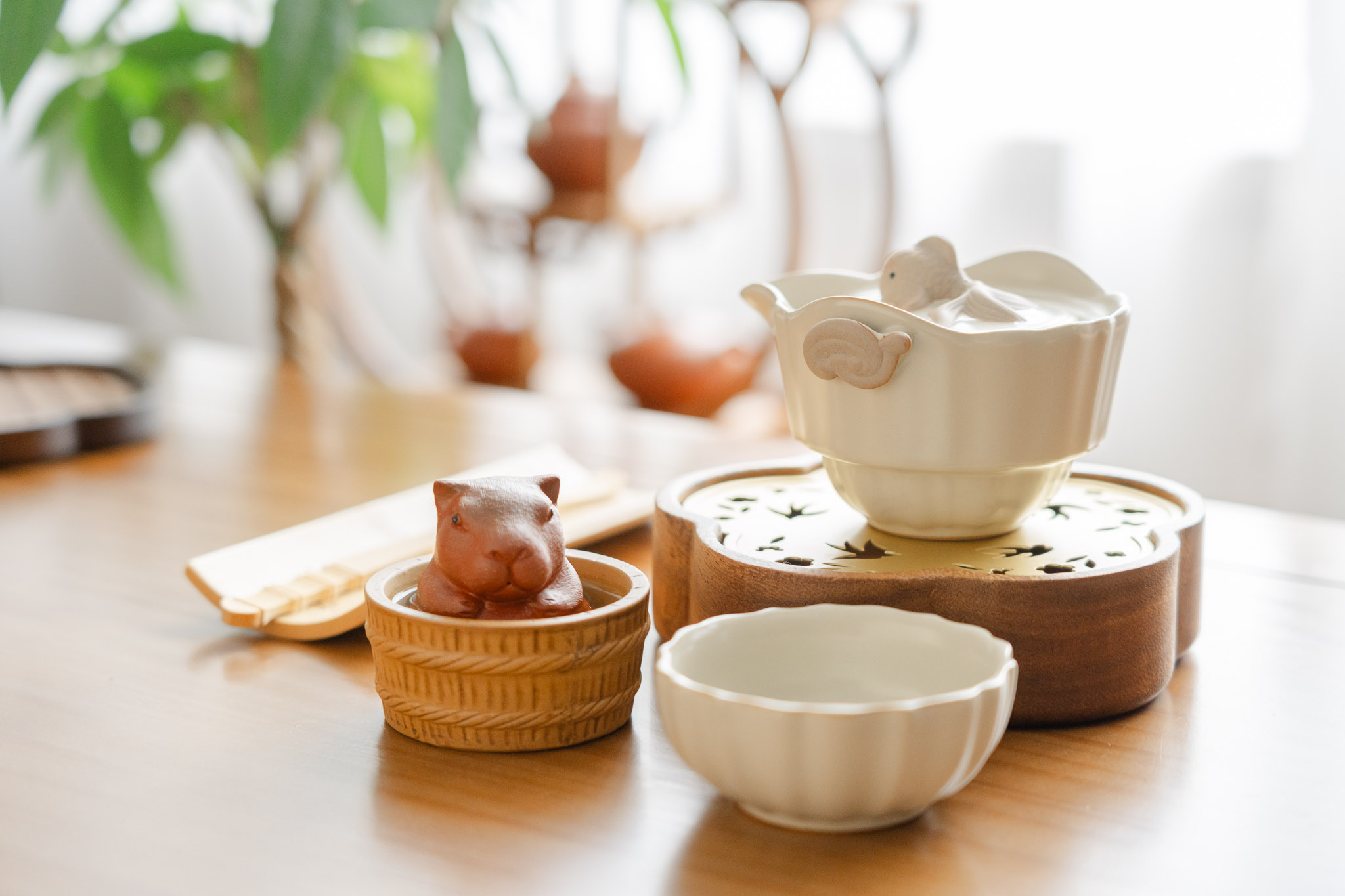 The set includes two ceramic cups. They are light, comfortable to hold, and remain cool enough for safe sipping. Share a relaxing moment with someone close, or enjoy a quiet cup by yourself.